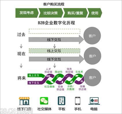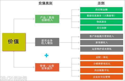 近年來,以云計算、大數據、社交媒體、移動互聯為代表的新興數字技術 和業態使得數字化對企業和個人的影響擴大, 我們正進入一個數字2.0時代。這 不僅在技術手段和能力上極大地豐富了B2B企業的電子商務,也擴大了其應用范 圍,目前B2B企業的電子商務早已超出最初的 “基于互聯網完成線上交易”的概 念,延伸到企業的銷售和采購端,以及企業價值鏈的各個環節,甚至是企業的外 部利益相關方,進而衍生出諸如B2C融合、供應鏈金融、大數據分析等多種創新 業務模式,使企業收入來源更加多元化。