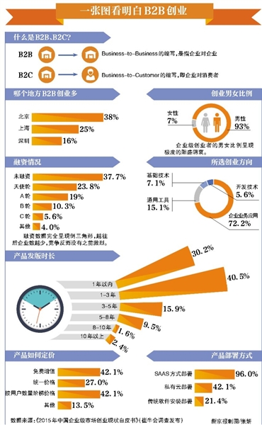 “現在的互聯網創業浪潮有點類似于19世紀加州的淘金熱。”B2B(企業對企業)創業項目“日志易”創始人陳軍說,“別的創業公司(B2C,企業對消費者)是淘金的,我們賣水、賣牛仔褲、賣鏟子、賣鋤頭,為他們提供工具和支持。”像陳軍一樣為“淘金者”服務的B2B創業項目日漸增多,但相比B2C的紅海,B2B領域仍是一片藍海。有機構曾公布過一個數據,美國企業數是2700萬家,美國有三大企業服務領軍公司,市值總和3500億美元,而中國有約2200萬家企業,卻連一家估值十億美元的B2B公司都沒有。看起來,一塊肥沃的市場正等待創客們。然而,機會真的來了嗎?在風口上,是否可以高枕無憂?今天下午,新京報聯手IDG資本,舉辦尋找中國創客論壇,以“席卷2015:B2B大風進行時”為主題,聚焦B2B領域創業。