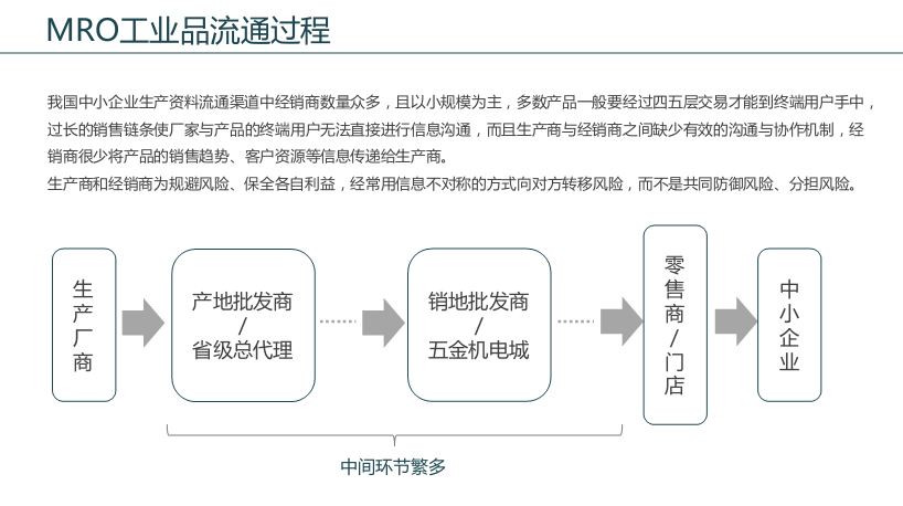 我國MRO工業品流通環節繁多,主要是從生產廠商、產地批發商、銷地批發商、零售店到中小企業,一般產品要經過至少4、5層交易,過長的銷售鏈條使廠家與產品之間無法直接形成信息溝通,缺乏有效的溝通協作,導致中小企業頭疼價格不透明,廠家頭疼庫存積壓問題。同時,由于中國工業品市場的長期混亂,生產商和經銷商為了規避風險,往往利用信息不對稱的方式轉移風險,金融賬期拖欠問題非常嚴重。