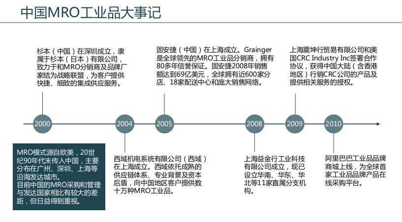 2000年,日本杉本公司組建的杉本(中國)工業品在線采購平臺在中國深圳成立。2004年,西域機電系統有限公司(西域)在上海成立。西域依托成熟的供應鏈體系、專業背景及資本后盾,向中國地區客戶提供數十萬種MRO工業品,儀器儀表產品。次年6月,固安捷(中國)在上海成立。固安捷(Grainger)是全球領先的設備維護、修理和運作(MRO)工業品分銷商,擁有80多年信譽保證。隨后,上海震坤行貿易有限公司與CRC合作搭建網絡銷售平臺、上海艾遜工業設備有限公司(艾遜網)、上海益金行工業科技有限公司(益金行)、樂百供(中國)、蘇州特立捷(中國)工業品銷售有限公司等陸續成立。2010年6月,阿里巴巴工業品品牌商城上線。經過15年的市場培養,MRO服務和MRO采購日益得到行業用戶的重視,MRO工業品網絡超市的模式也逐漸得到中國市場的認可。