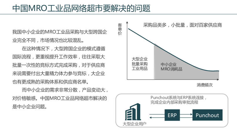 我國中小企業的MRO工業品采購與大型跨國企業完全不同,市場情況也比較混亂。大型跨國企業的模式遵循國際流程,有類似Punchout這樣國際化標準體系接入企業內部的ERP系統。企業也更重視工作效率的提升而非單純的利潤空間,往往采取大批量一次性的競標方式完成采購,對于供應商來說需要付出大量精力體力參與競標,大企業也有更成熟的采購體系和供應商名單。而中小企業的需求非常分散,產品變動大,對價格敏感。中國MRO工業品網絡超市解決的是中小企業問題。