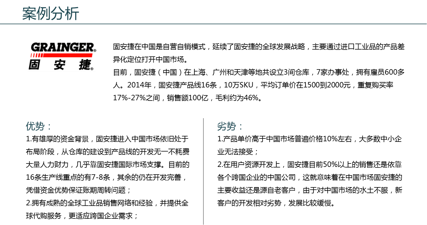 一是從國際市場拓展業務走進中國市場的,如固安捷、杉本、皇加力等,這類企業不以短期盈利為目的,重倉儲物流全體系建設,通過全球原有客戶帶動平臺銷售,主要面對大型跨國企業;