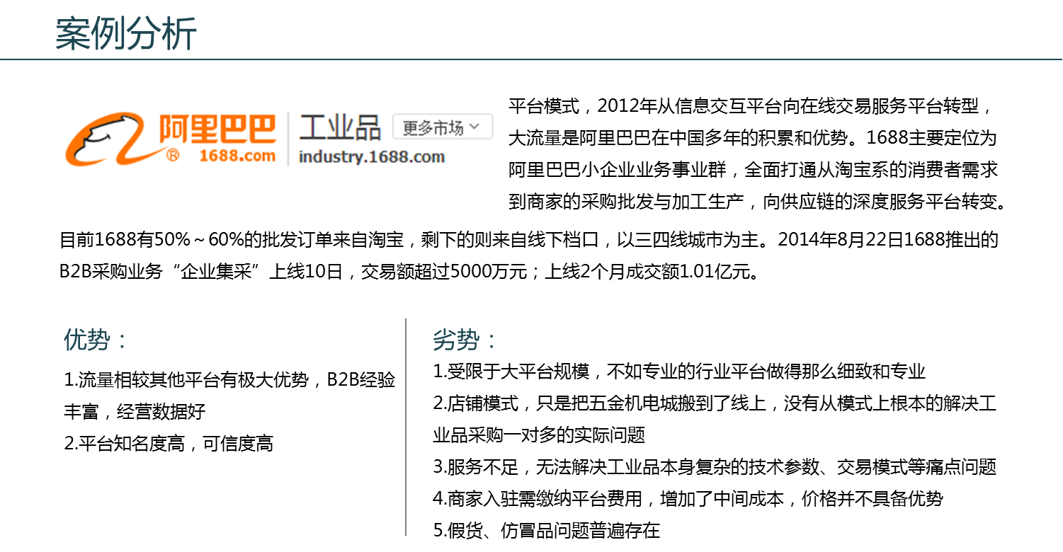 總體來說,由于中國工業品市場環節多,信息不對稱,背景關系復雜,產品魚龍混雜的情況,國際企業進入中國市場后普遍不同程度的出現水土不服現象,但因國際市場與中國市場的對接,暫時沒有影響到企業生存。而對于一部分中國的綜合工業品超市,盲目擴張往往會被資金短缺、對行業了解不足等絆住了前進的步伐,垂直領域尚在小范圍打鬧,未見有規模有體量的企業跑出市場。