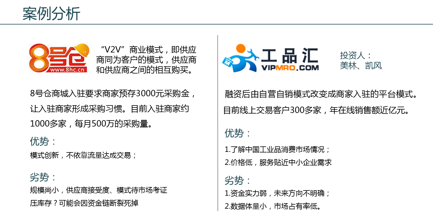 三是在工業品領域做垂直細分平臺,如專注于軸承領域的陌貝網、多家佛山裝備制造業龍頭企業共同發起成立的小五金O2O平臺拿貨去網等,垂直細分領域也許有短期市場的迅速擴張,但沒有解決工業品采購品類多、對接供應商多的根本問題。