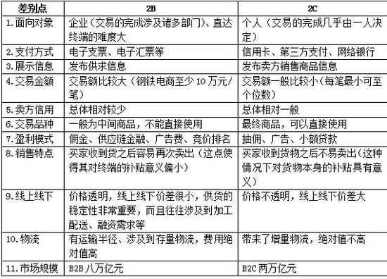 鋼鐵電商(2B,生產資料電商)和生活資料電商(2C)都是電商,本質都是提供便利、高性價比的渠道,并且在初期基本上都是虧錢,需要大量融資,預期成熟期的盈利模式中均包括抽傭、供應鏈金融、廣告等。鋼鐵電商和生活資料電商也存在諸多方面的不同,具體如下表: