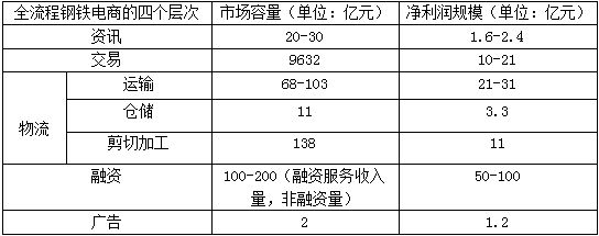 簡單將上述的七個環節匯總,鋼鐵電商平臺的市場容量可望達到9971-10116億元,凈利潤規模98-170億元。