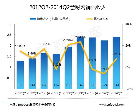 財報顯示,2014年上半年互聯網服務收入為4.1億人民幣,占到整體銷售收入的88.17%,為慧聰網主要收入來源。其中2014年第1季度互聯網服務收入貢獻為1.91億人民幣,環比下降4.91%,占到第1季度整體收入的85.37%,雖小幅下降,但對整體收入的貢獻仍占據重要地位;2014年第2季度互聯網服務收入貢獻為2.19億人民幣,環比增長14.32%,是慧聰網2014年第2季度收入增長的主要原因,占據第2季度整體收入90.53%。主要由于慧聰網加強平臺營銷,提升自身營銷能力,如同百度合作,通過百度搜索引擎為慧聰網平臺用戶服務,提升平臺用戶爆光率,從而加強互聯網服務能力。