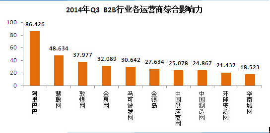 有數據研究顯示,2014年第三季度B2B行業各運營商綜合影響力前十名分別為:阿里巴巴、慧聰網、敦煌網、金泉網、馬可波羅網、金銀島、中國供應商網、中國制造網、環球資源網、華南城網。(如下圖所示)