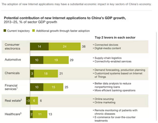 麥肯錫全球研究所發(fā)布最新報告,對這種即將到來的轉變進行了概述。他們的研究顯示,中國企業(yè)正向互聯(lián)網經濟基石領域投入巨資,包括云計算、無線通信、新數(shù)字平臺、大數(shù)據(jù)分析等。2013年,消費電子、汽車、化學工業(yè)、金融服務、房地產以及醫(yī)療等6個部門共占中國經濟活動的25%,到2025年,互聯(lián)網普及將幫助向它們每個領域增加600億到1.2萬億元價值,這些收益中約1/3將來自于全新的市場。當我們將這種增長水平擴大到所有經濟部門時,我們發(fā)現(xiàn),到2025年,互聯(lián)網普及可能為GDP注入4萬億到14萬億元價值。在2013年到2015年間,互聯(lián)網有望為GDP增長貢獻7到22個百分點。