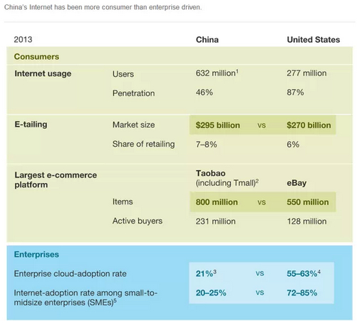 麥肯錫全球研究院最新的解讀報告稱,直到近來,中國互聯(lián)網經濟依然靠消費驅動。中國擁有世界上最多的網民,中國企業(yè)正采用更為先進的電商策略。但在利用互聯(lián)網推動各自關鍵業(yè)務方面,這些公司依然落后于美國和其他發(fā)達國家的同行。但是這種情況正發(fā)生改變。