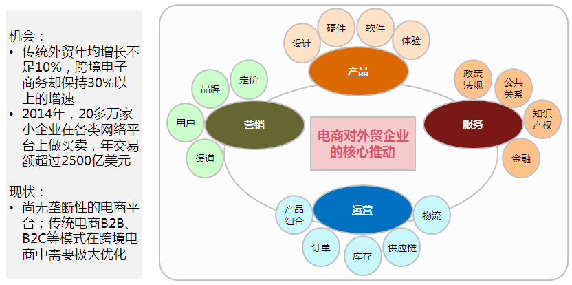 去年整個中國的出口外貿總額達14萬億元,其中電商占4萬億元左右,27%左右,這里面又分兩塊,B2C和B2B,其中B2B占95%的份額,B2C大概150億元,約5%左右的份額。