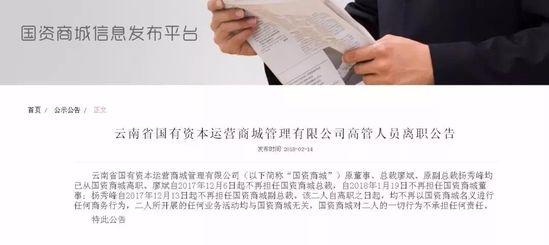 此外,據(jù)都市時(shí)報(bào)報(bào)道,國資商城于2月14日發(fā)布公告稱,原董事、總裁廖斌自2017年12月6日起不再擔(dān)任國資商城總裁,自2018年1月19日不再擔(dān)任國資商城董事;總裁楊秀峰自2017年12月13日起不再擔(dān)任國資商城副總裁。該二人自離職之日起,均不再以國資商城名義進(jìn)行任何商務(wù)行為,二人所開展的任何業(yè)務(wù)活動(dòng)均與國資商城無關(guān),國資商城對(duì)二人的一切行為不承擔(dān)任何責(zé)任。