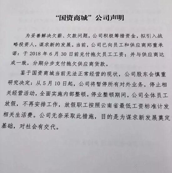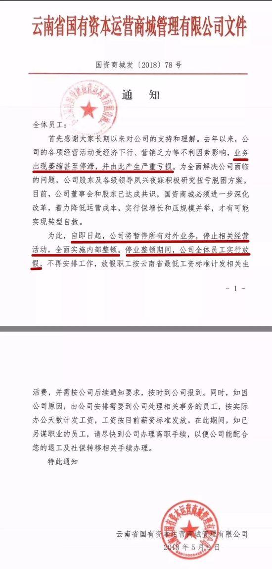 【億邦動(dòng)力訊】5月9日,云南省國有資本運(yùn)營商城管理有限公司發(fā)布了一份文件稱,“國資商城”受多種因素影響,業(yè)務(wù)已嚴(yán)重虧損,公司將暫停所有對(duì)外業(yè)務(wù),停止相關(guān)經(jīng)營活動(dòng),全面實(shí)施內(nèi)部整頓。