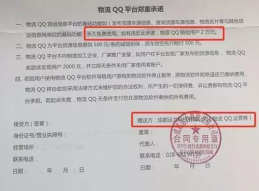 貨車幫的前身“物流QQ”就曾對司機和貨主們許諾“永久免費”,還簽訂過承諾協議,并宣稱“如有違反承諾,物流QQ賠償用戶2萬元”。