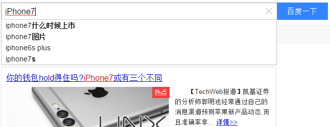 今天我選擇了"iPhone7"這個詞來作為我們的案例詞,要想了解這個詞的需求,通常情況下,我是利用百度下拉框和百度相關搜索來分析的,比如第一個人想知道iPhone7什么時候上市,搜索關鍵詞"iPhone7"后沒有找到答案,于是又搜索了關鍵詞"iPhone7什么時候上市",才能找到他滿意的答案,那么可以我們可以斷定,這個用戶搜索"iPhone7"的需求就是想知道上市時間,其實用戶在兩次搜索關鍵詞的時候,百度已經記錄了該用戶搜索的URL,仔細的朋友搜索兩次,你會發(fā)現URL有明顯的變化。那么第一個人、第二個人、第一萬個人、第十萬個人都是這樣搜索的呢,自然就創(chuàng)造了用戶在搜索"iPhone7"的時候,最大需求為"上市時間"。需求最大的時候,搜索引擎會怎么辦呢,當然搜索引擎不會讓用戶搜索兩次才找到答案的,那就把關于"上市時間"的內容排名提升上來。