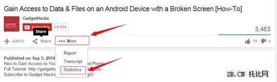 我們可能會遇到這種情況,就是某個視頻觀看量特別高,有幾千甚至幾萬,但贊的人特別少,也基本上沒有人評論。那這個視頻,很有可能就是虛假的觀看量,識別虛假觀看量的方法是,點開視頻下方的More,然后選擇statistics