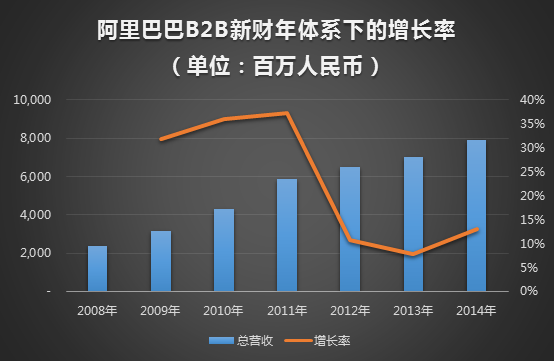 阿里巴巴B2B業務2012年中從港交所退市,給了B2B行業老二們一個機會,在沒有財務數據對標的前提下,都在放大自己營收增長的效果。久而久之,很多投資者和研究者形成了這樣一種心態,用行業老二們的新營收數據與阿里最后一個季度、最后一個財年的數據做比照,似乎阿里的B2B部門從此停滯不前,乃至發生倒退,而行業老二們則在迅速地迫近阿里巴巴。