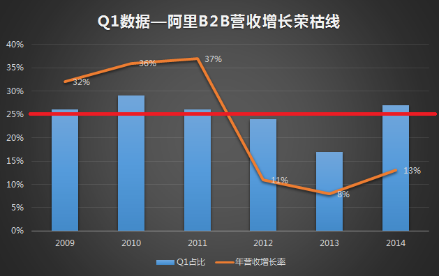 二、井噴的2014年Q1是怎么回事?一季度是否達到25%的占比將是阿里巴巴B2B業務增長與否的評價標線