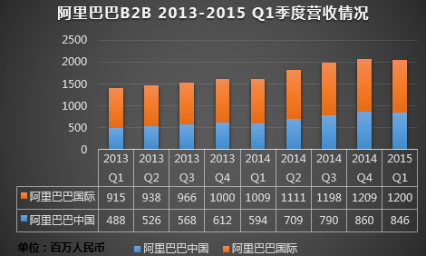 北京時間5月7日晚,阿里巴巴集團財報數據公布的同時,阿里巴巴2015年第一季度的B2B業務數據浮出水面。2015年第一季度,阿里巴巴國際營收達約12億人民幣,同比增長達49%,環比微跌0.74%;阿里巴巴中國營收達8.46億人民幣,同比增長達19%,環比下滑1.11%。在外貿、內貿業務的共同推動下,阿里巴巴B2B業務總營收達20.46億人民幣,同比增長達27.6%,阿里巴巴季度營收連續三個季度同比增長率超過25%。與多家B2B上市公司相比,阿里巴巴的營收增長幅度明顯優于行業平均水平。(上海鋼聯的模型由于不能簡單通過營收單項對比,刨除在外)