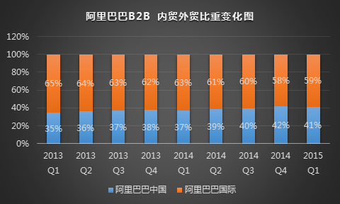 盡管阿里巴巴內部對于B2B 業務中內貿與外貿的比重并沒有設定目標值,不過從行業的角度,其比值可以一定程度反映出B2B行業內貿/外貿的景氣程度,從而為行業其他業者提供參考。