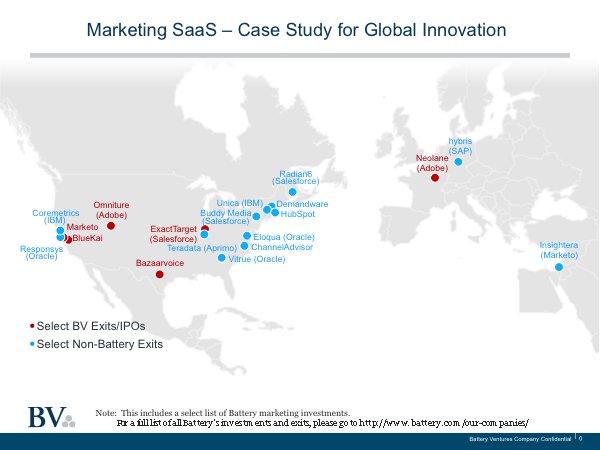 那是我們在數字營銷技術領域的第一次投資。自那之后,我們在這一領域四處出擊。我們很幸運地先后投中了Marketo(已在納斯達克上市,代碼:MKTO)、Exact Target(于2013年6月被Salesforce以25億美元的價格收購)、Bazaarvoice(已在納斯達克上市,代碼:BV)、BlueKai(于2014年2月被Oracle以4億美元的價格收購)還有Neolane(于2013年7月被Adobe以6億美元的價格收購)等非常偉大的公司。