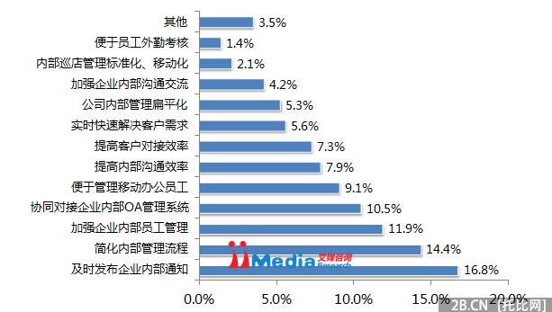 “發布通知”和“簡化管理”是中小企業使用企業號的主要目的