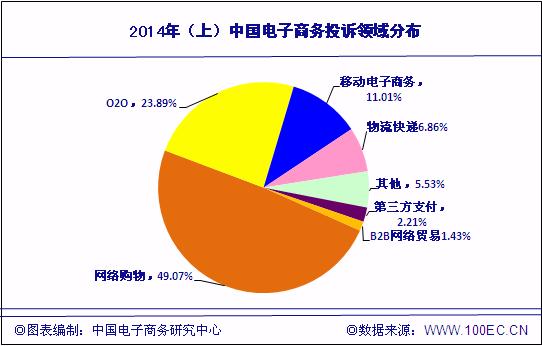 圖表顯示:2014年上半年,中國電子商務投訴主要分布在網絡購物、O2O、移動電子商務(微信購物、電商移動端購物等)、物流快遞、第三方支付、B2B網絡貿易等領域。其中,網絡購物投訴占比最大,為49.07%;其次是O2O領域,為23.89%;然后是移動電子商務領域,11.01%;物流快遞領域,6.86%;第三方支付領域,2.21%;B2B網絡貿易,1.43%;其他,5.53%。