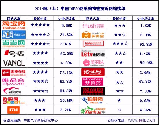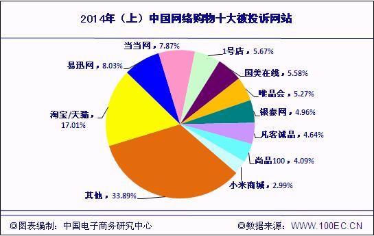 圖表顯示:據中國電子商務投訴與維權公共服務平臺監測數據顯示,淘寶/天貓、易迅網、當當網、1號店、國美在線、唯品會、銀泰網、凡客誠品(包括凡客自營電商部分以及V+商城)、尚品100、小米商城為“2014年(上)中國網絡購物十大被投訴網站”。