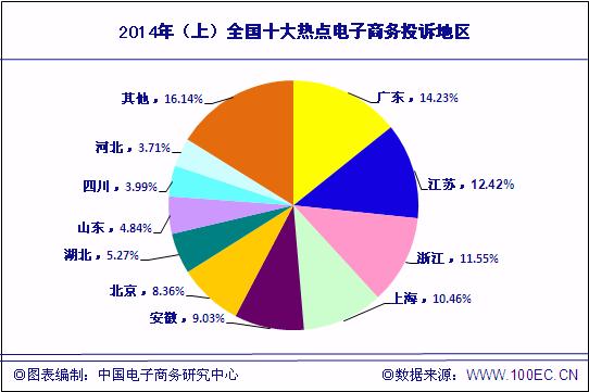 圖表顯示:據中國電子商務投訴與維權公共服務平臺監測數據顯示,2014年上半年電子商務用戶投訴熱點地區分別為廣東占14.23%,江蘇占12.42%,浙江占11.55%,上海占10.46%,安徽占9.03%,北京占8.36%,湖北占5.27%,山東占4.84%,四川占3.99%,河北占3.71%,其他為16.14%。
