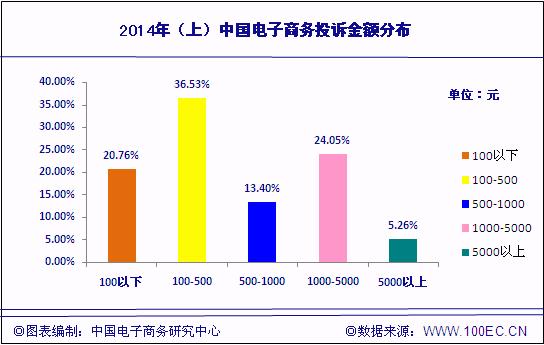 圖表顯示:據中國電子商務投訴與維權公共服務平臺監測,2014年上半年100-500元區間的投訴金額占比最大,為36.53%,其次是1000-5000元,為24.05%;100元以下,為20.76%;500-1000元,為13.40%,而5000元以上的投訴金額占比最少,僅5.26%。