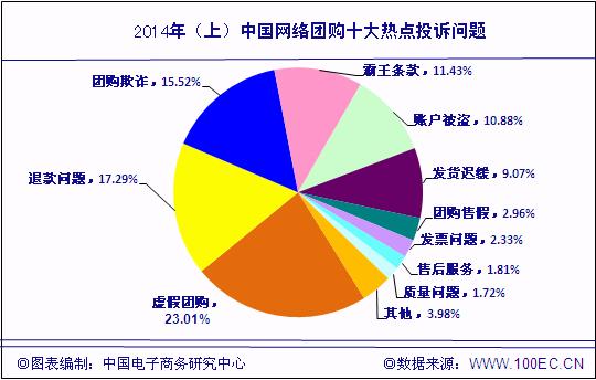 圖表顯示:據中國電子商務投訴與維權公共服務平臺監測數據顯示,虛假團購、退款問題、團購欺詐、霸王條款、賬戶被盜、發貨遲緩、團購售假、發票問題、售后服務、質量問題為“2014年(上)十大網絡團購熱點投訴問題”。
