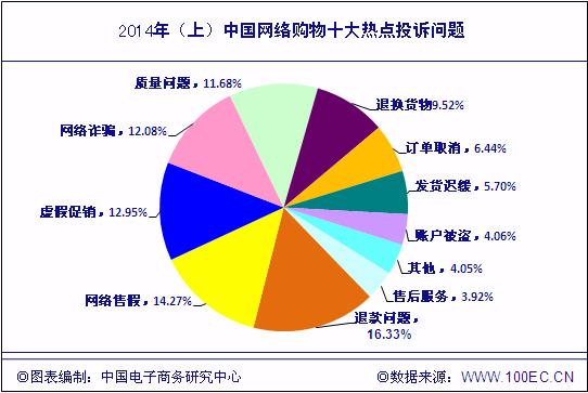 圖表顯示:據中國電子商務投訴與維權公共服務平臺監測數據顯示,退款問題、網絡售假、虛假促銷、網絡詐騙、質量問題、退換貨物、訂單取消、發貨遲緩、賬戶被盜、售后服務為“2014年(上)十大網絡購物熱點投訴問題”。
