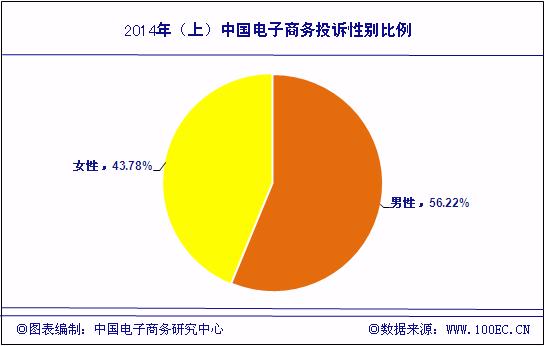 圖表顯示:據中國電子商務投訴與維權公共服務平臺監測數據顯示,在2014年上半年電子商務投訴中,男性用戶占比56.22%,而女性用戶僅為43.78%。
