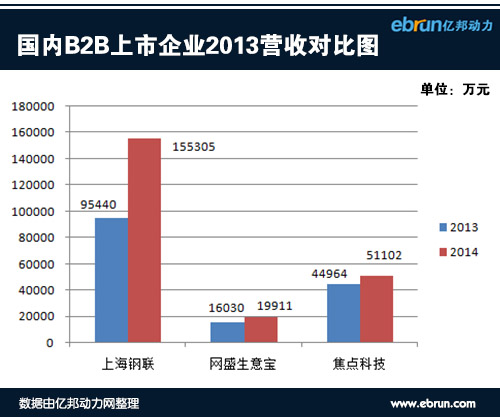 從數(shù)據(jù)圖中,億邦動(dòng)力網(wǎng)發(fā)現(xiàn),三家企業(yè)均保持著較強(qiáng)的營收能力,相比2012年,營收上都獲得了較好的增長。其中上海鋼聯(lián)由于其控股子公司上海鋼銀電子商務(wù)有限公司所從事的鋼材現(xiàn)貨交易服務(wù)業(yè)務(wù)的快速發(fā)展,使其營收規(guī)模和增長速度上均排在了首位,交易額突破了15億元。