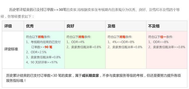據(jù)介紹,賣家服務(wù)等級(jí)每月評(píng)定一次,并于次月3日前在后臺(tái)更新,用以考核過(guò)去90天賣家的經(jīng)營(yíng)能力,包括賣家責(zé)任裁決率和好評(píng)率,特別是買家不良體驗(yàn)訂單率(Order Defect Rate,簡(jiǎn)稱ODR),即買家不良體驗(yàn)訂單占所有考核訂單的比例。根據(jù)考核結(jié)果,將賣家分為優(yōu)秀、良好、及格和不及格賣家,不同等級(jí)的賣家將會(huì)獲得不同的平臺(tái)資源。分析如下圖: